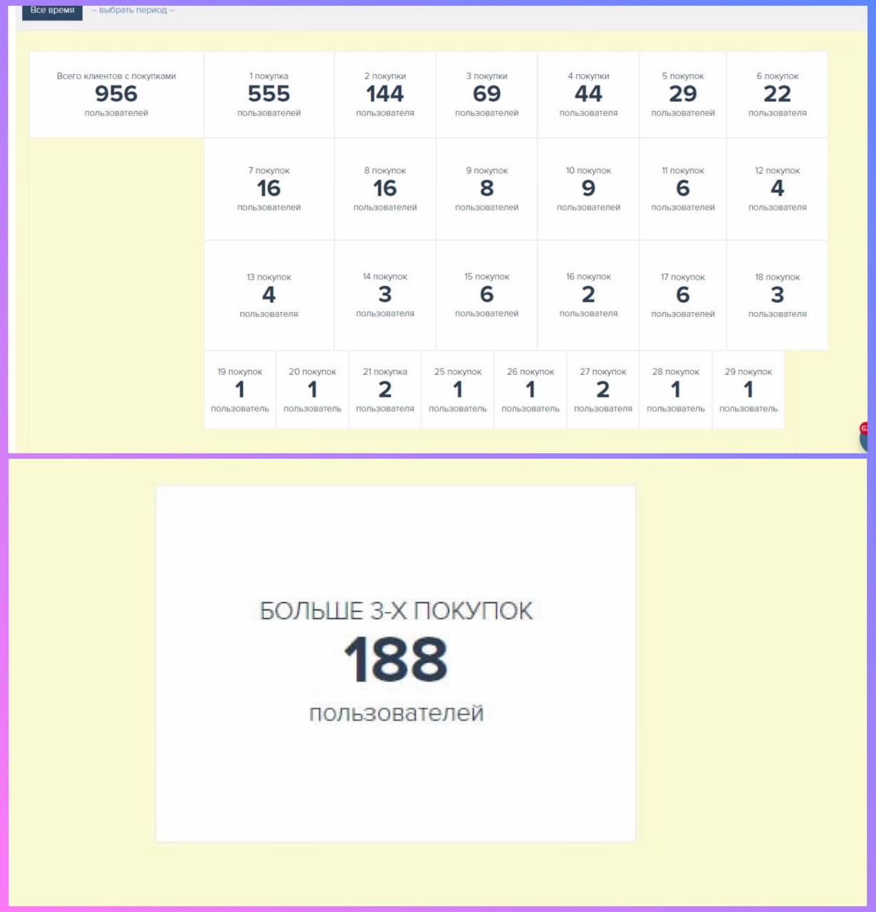 В моем проекте именно так. На днях мы посмотрели на геткурсе количество повторных покупок, совершенных одним человеком, и офигели — 6 продуктов покупал в среднем 1 человек за последний год👇