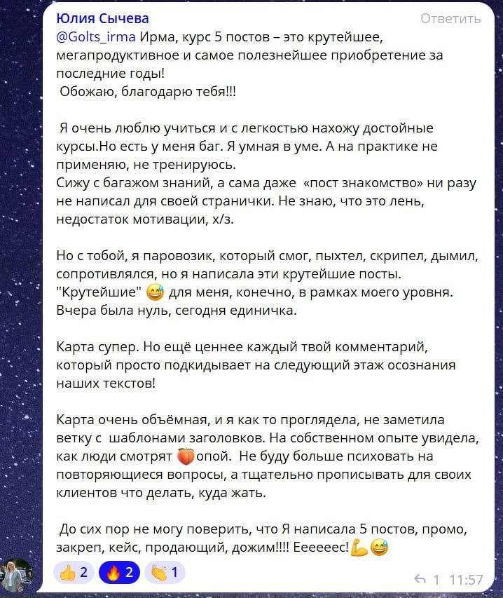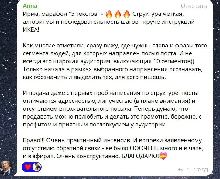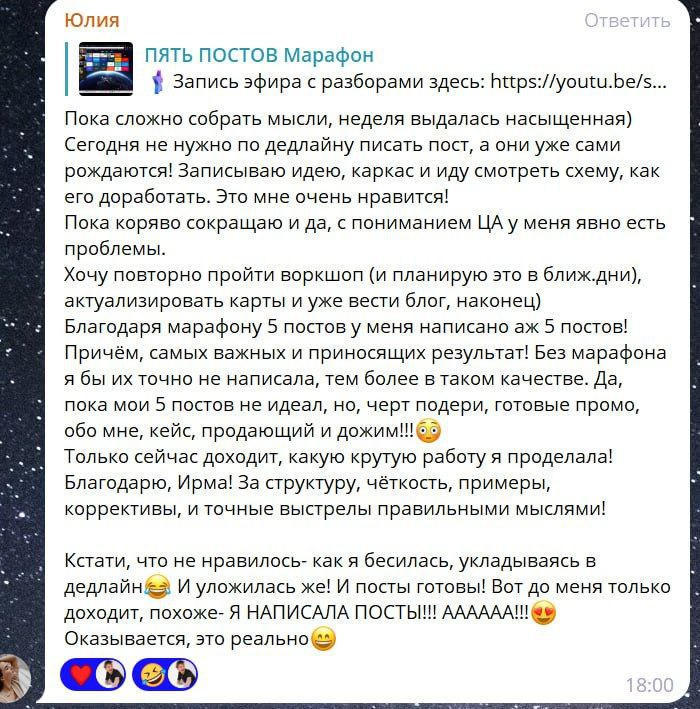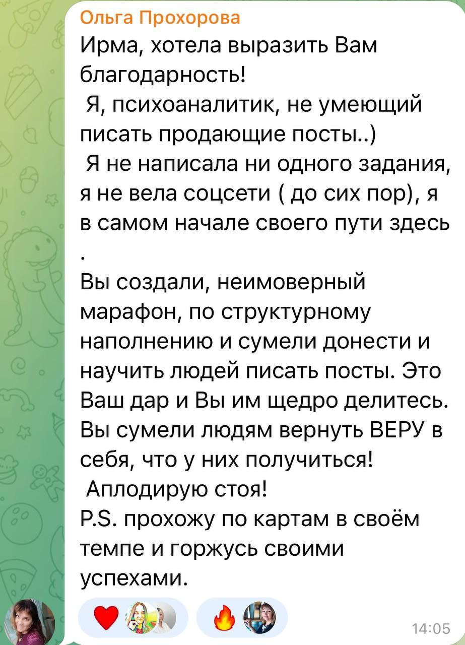 Я провела марафон «5 постов» всего лишь один раз. После этого я добавила информацию из этого марафона в моё большое обучение «СИСТЕМНЫЕ ПРОДАЖИ», где я учу экспертов на практике выводить запуск в плюс.