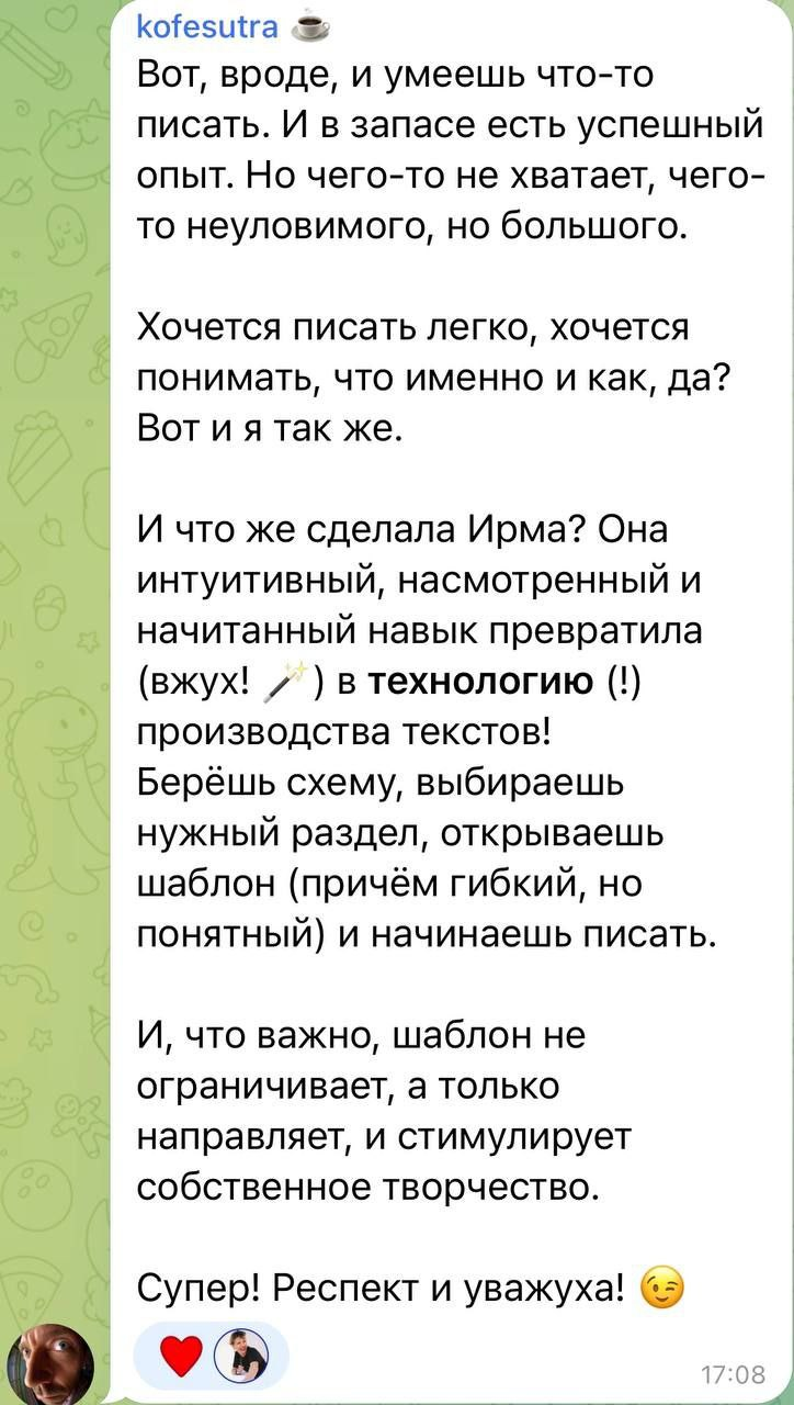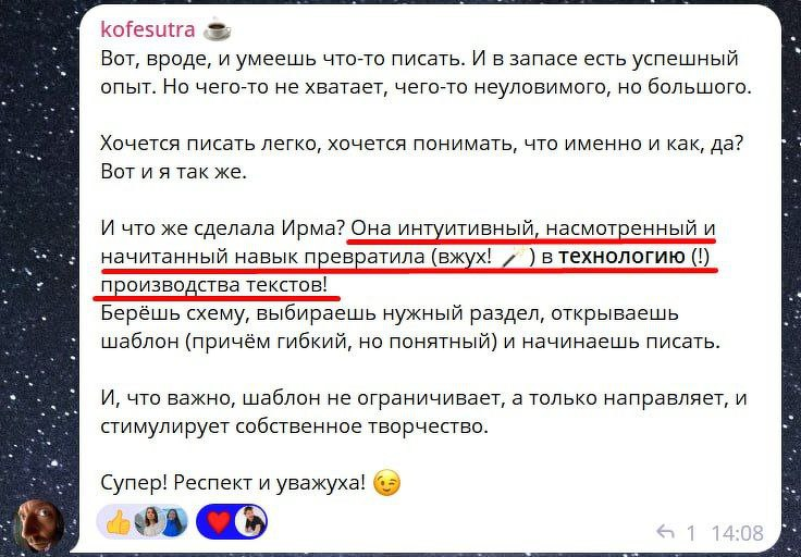 Я проработала много лет копирайтером и умею вводить читателей в гипноз обычным текстом. Это когда мы отключаем критическое мышление и позволяем воспринимать наши смыслы напрямую подсознанием.