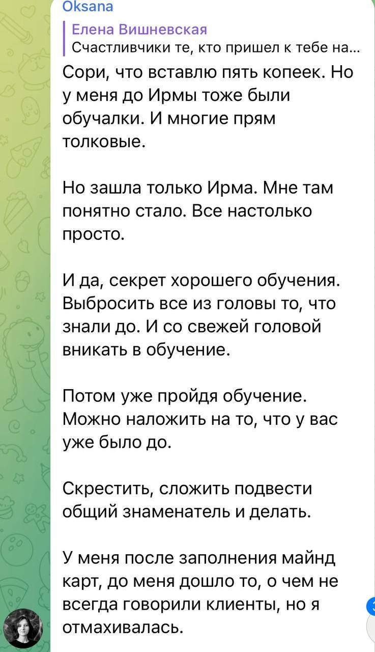 Я провожу мастер-майнды и другие обучения, где беру уже опытных продюсеров, экспертов, копирайтеров и вникаю в их проекты.